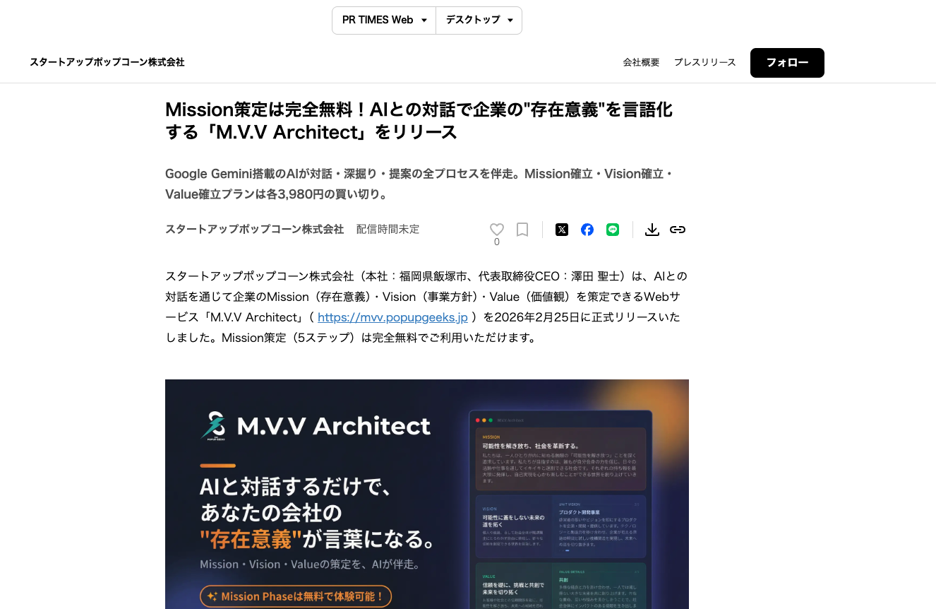 スタートアップポップコーン株式会社(本社:福岡県飯塚市、代表取締役CEO:澤田 聖士)は、AIとの対話を通じて企業のMission(存在意義)・Vision(事業方針)・Value(価値観)を策定できるWebサービス「M.V.V Architect」( https://mvv.popupgeeks.jp )を2026年2月25日に正式リリースいたしました。Mission策定(5ステップ)は完全無料でご利用いただけます。